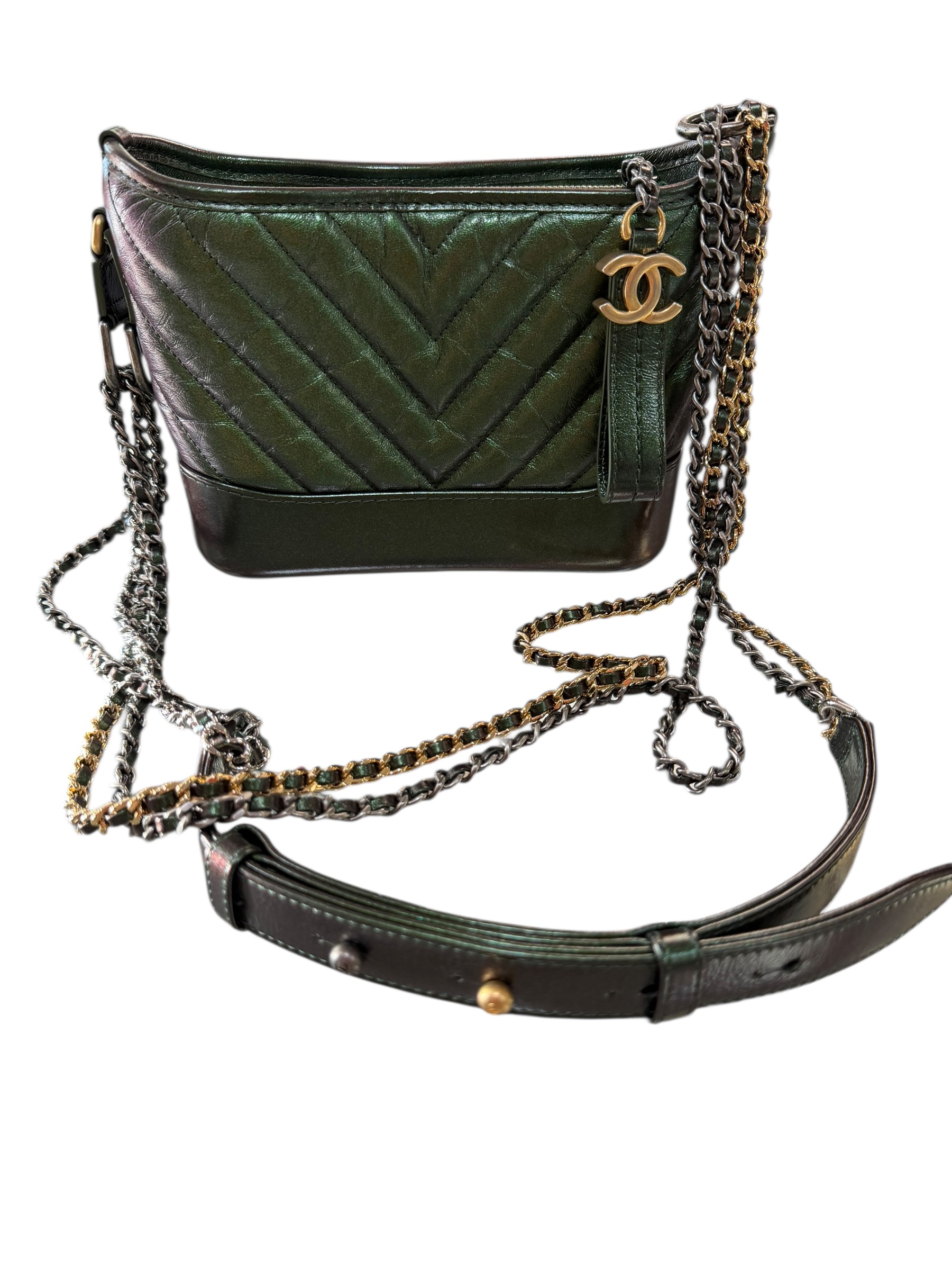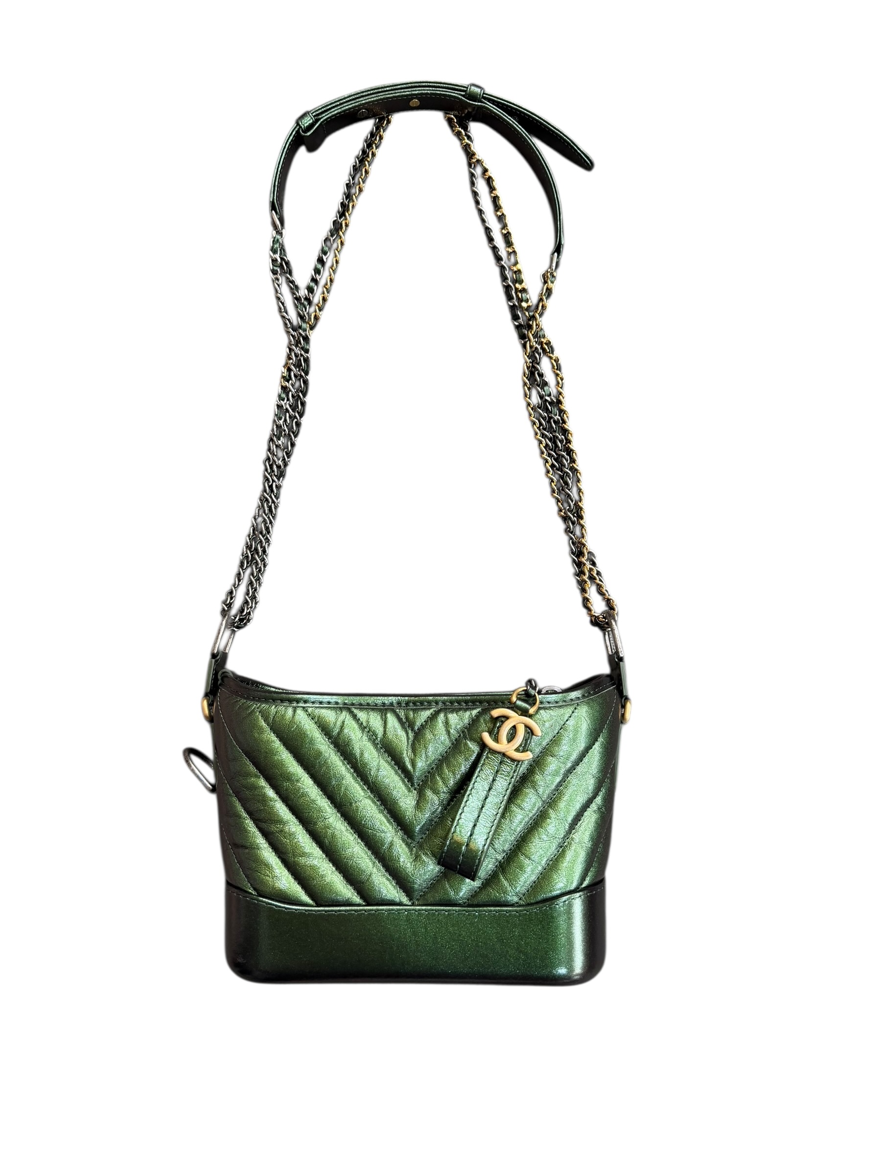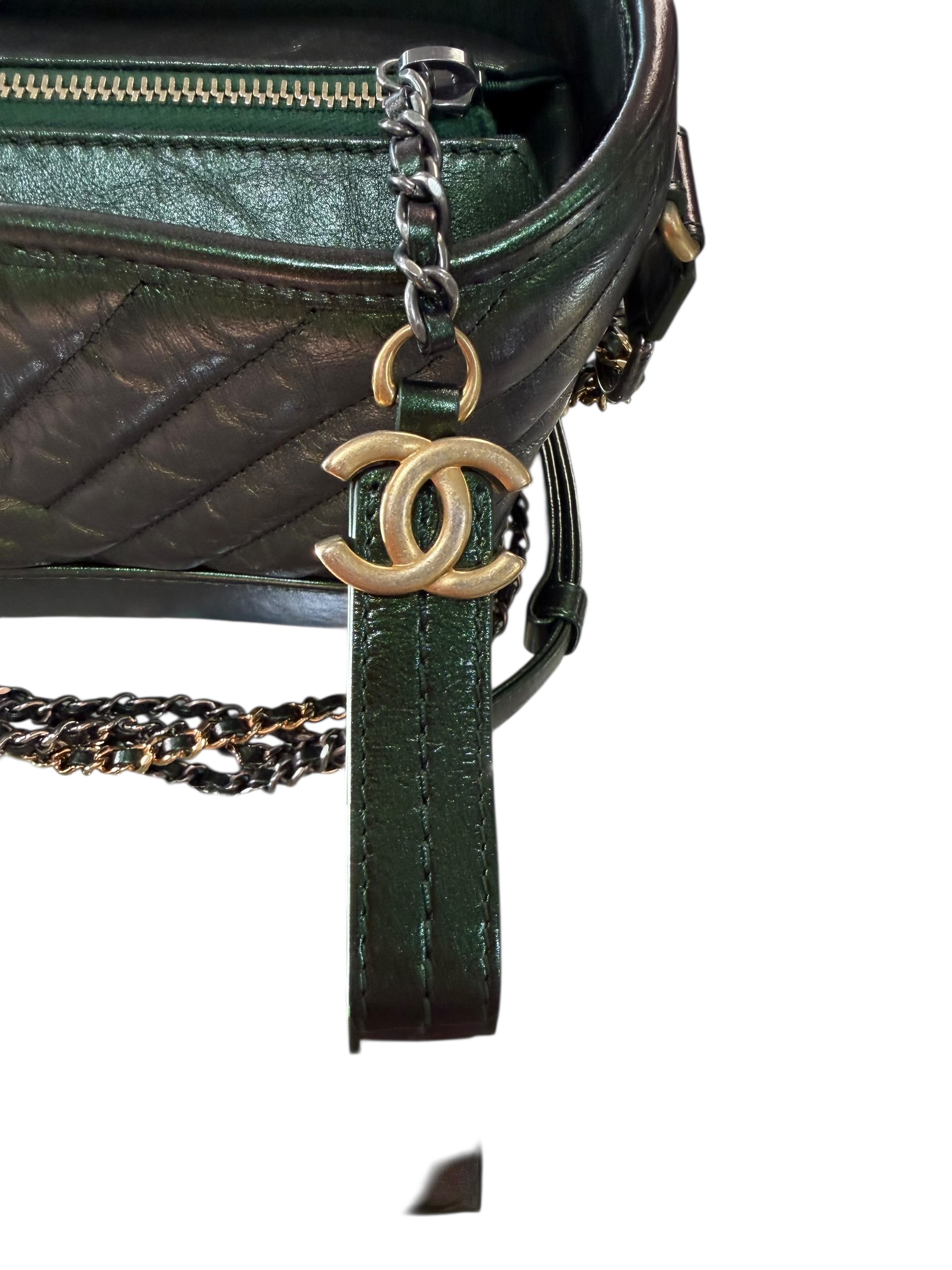 This is an authentic Chanel Gabriele bag in a stunning metallic green quilted leather with a chevron pattern. It features a classic gold-tone Chanel CC logo charm and an adjustable leather strap with chain detailing for crossbody or shoulder wear. The bag is compact yet functional, perfect for carrying essentials. It comes with its original Chanel authenticity card, ensuring its genuine status. This bag is an elegant choice for both casual outings and formal occasions.