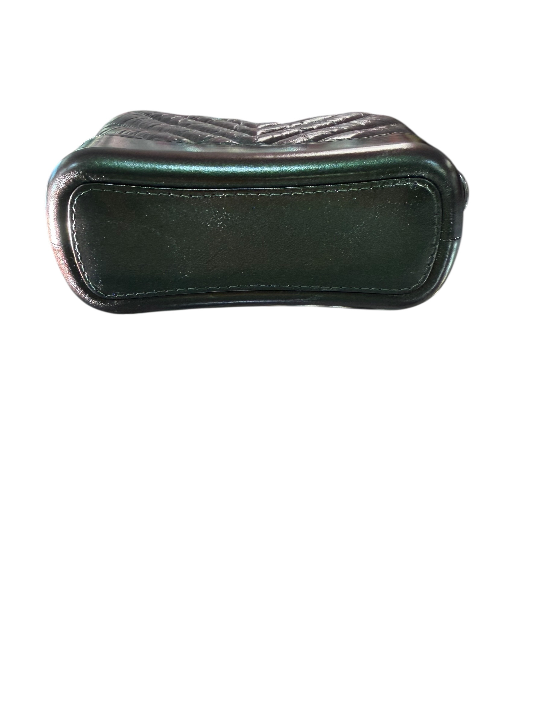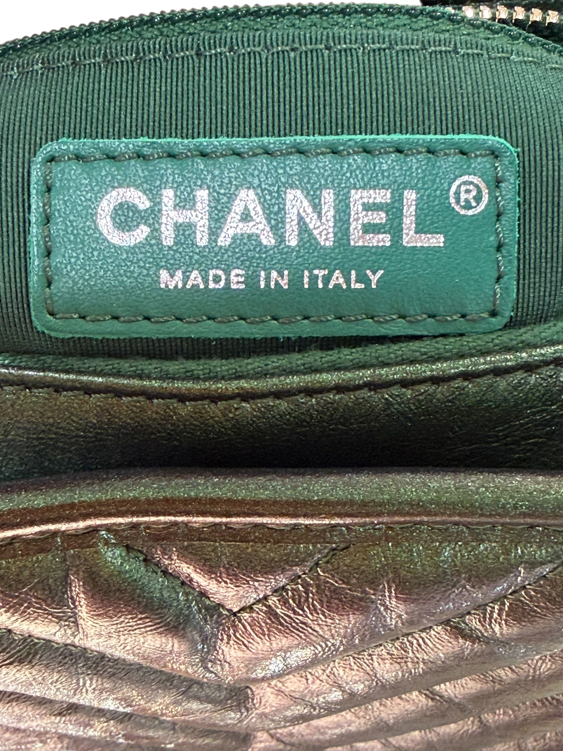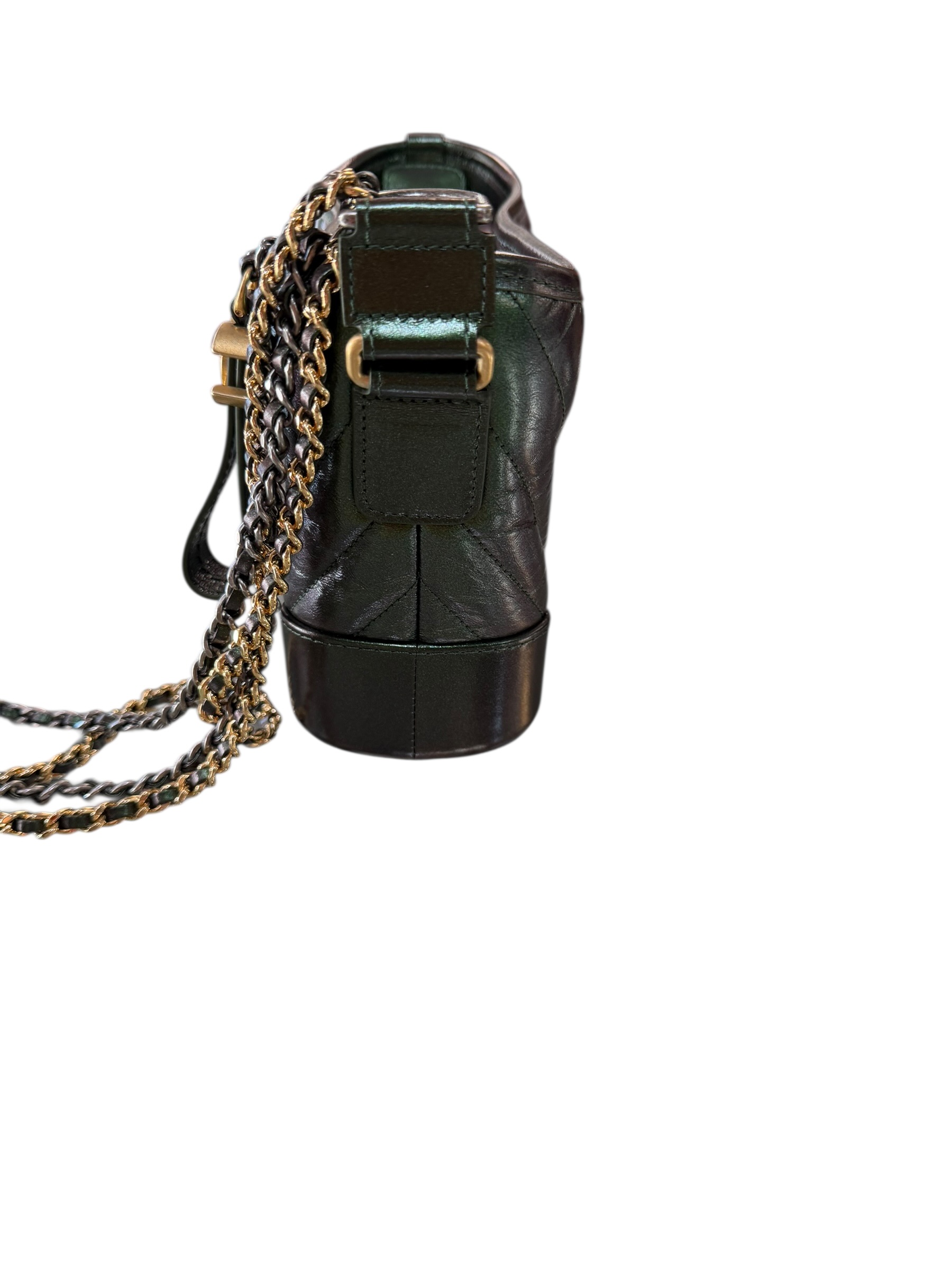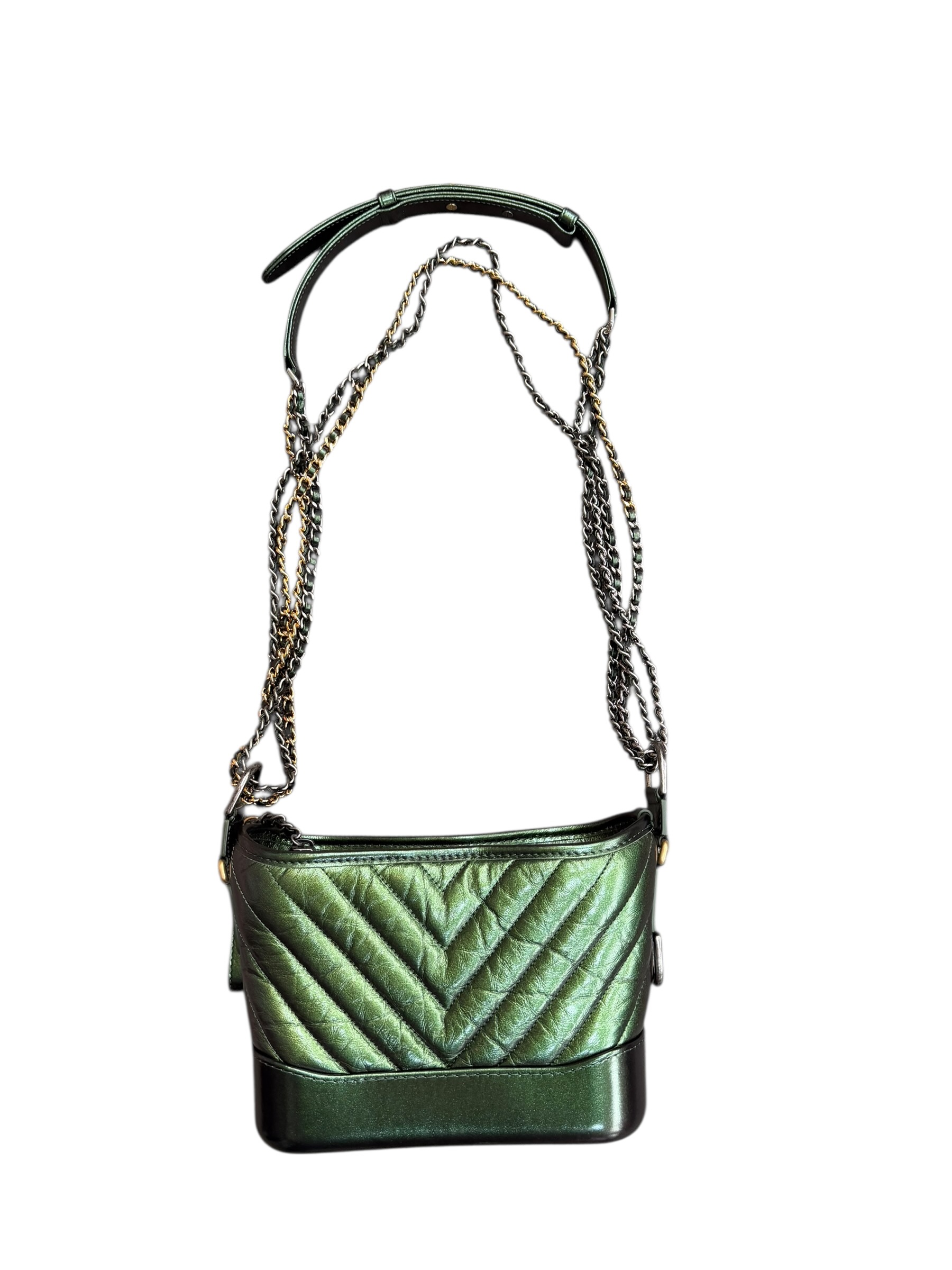 This is an authentic Chanel Gabriele bag in a stunning metallic green quilted leather with a chevron pattern. It features a classic gold-tone Chanel CC logo charm and an adjustable leather strap with chain detailing for crossbody or shoulder wear. The bag is compact yet functional, perfect for carrying essentials. It comes with its original Chanel authenticity card, ensuring its genuine status. This bag is an elegant choice for both casual outings and formal occasions.