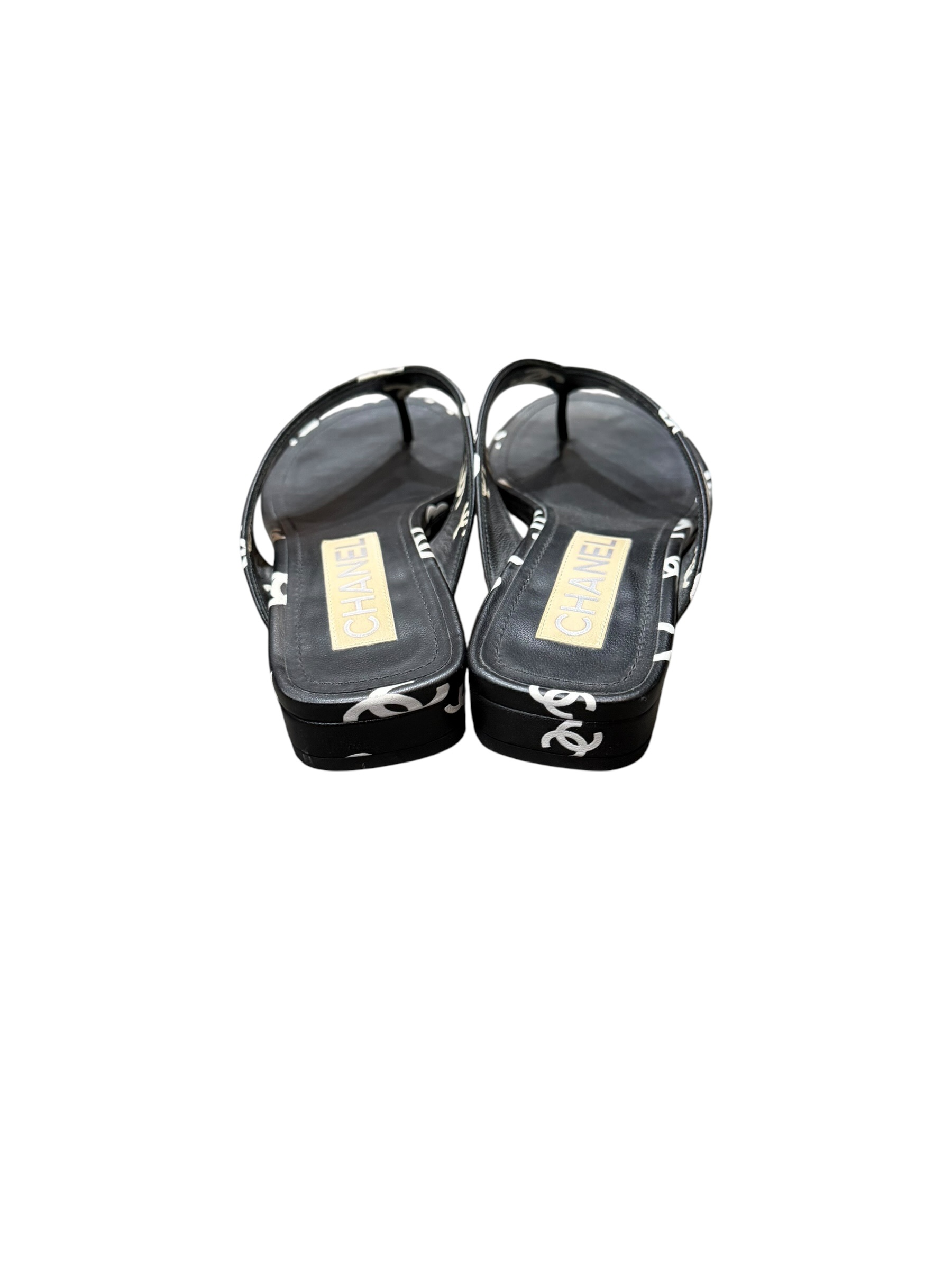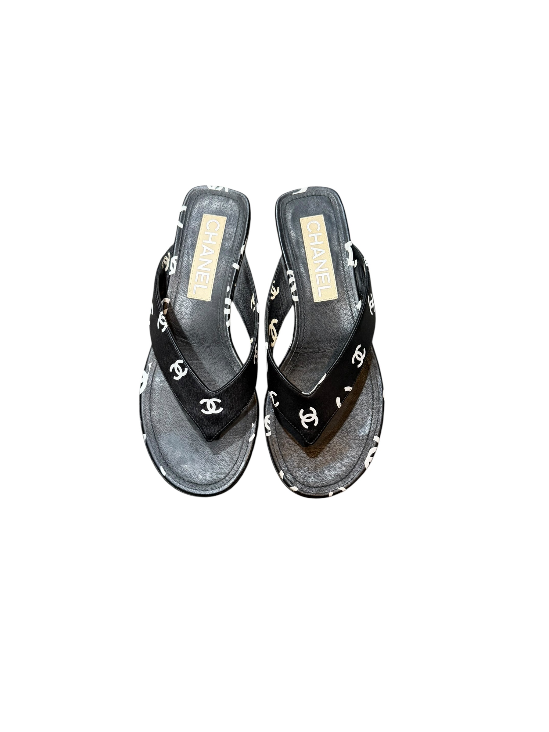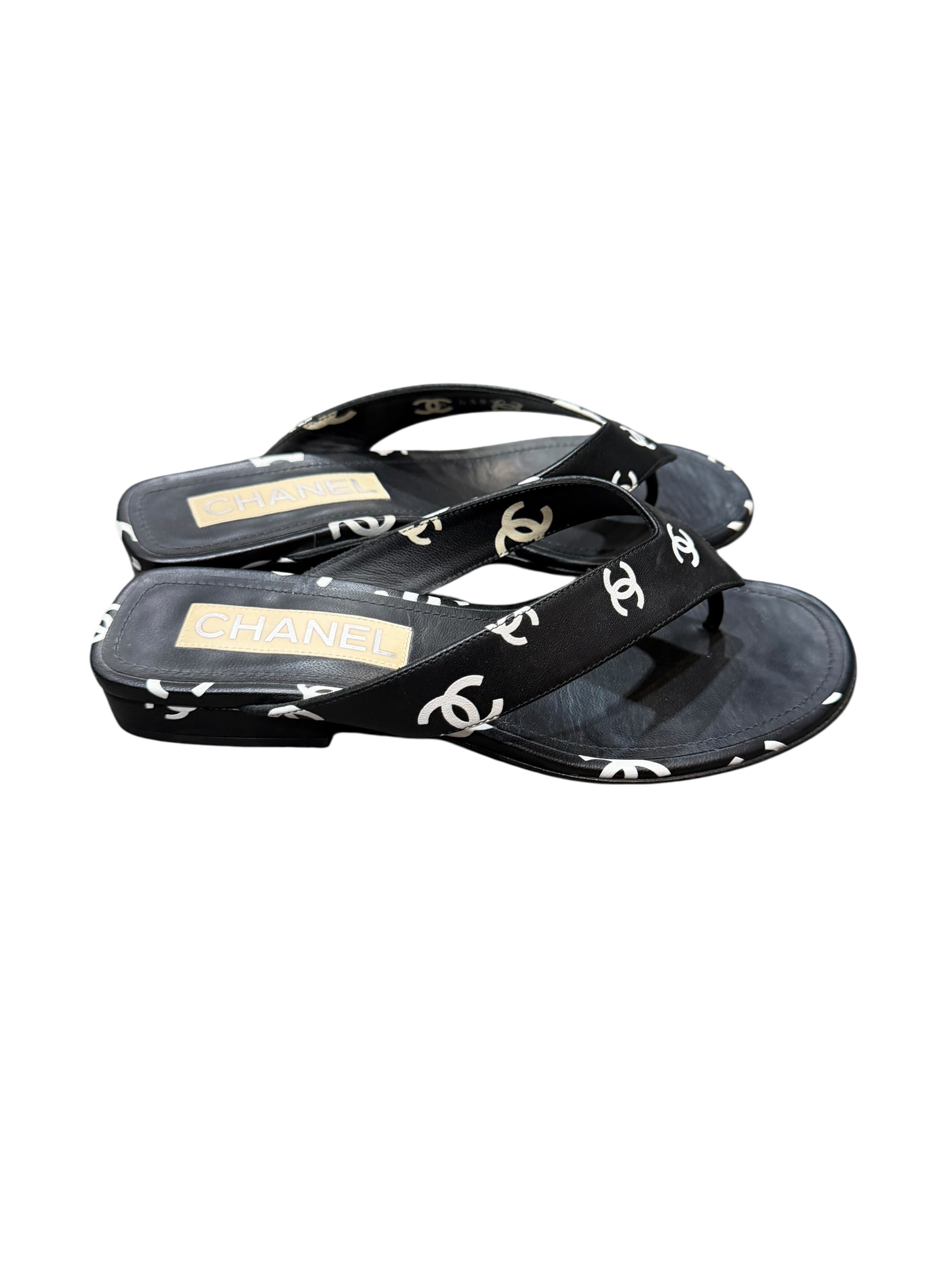 Elevate your style with these stunning Chanel leather black sandals! Crafted from premium leather and adorned with the iconic Chanel logo, these sandals are the epitome of luxury and sophistication. The sleek black design ensures versatility, making them perfect for any occasion, from casual outings to elegant evenings. The bold white logos add a touch of timeless elegance that Chanel is renowned for.