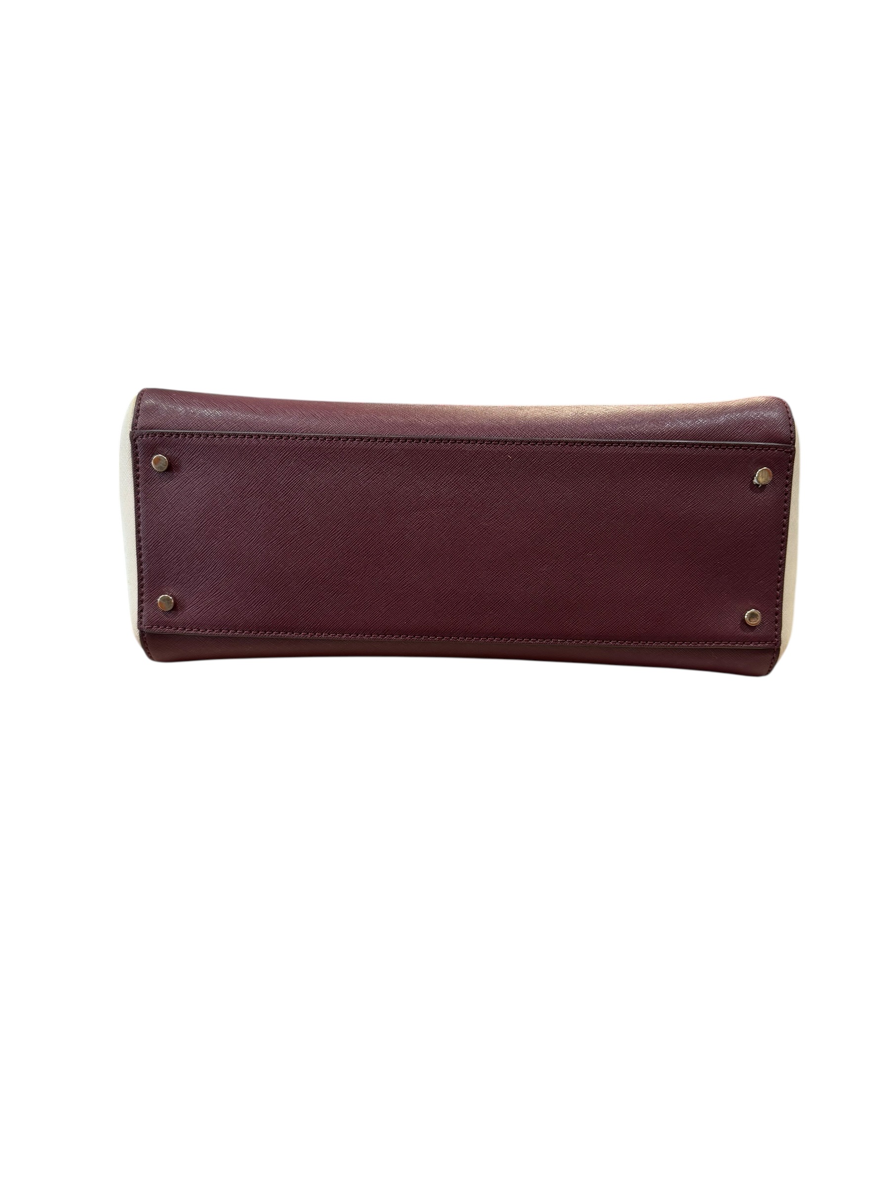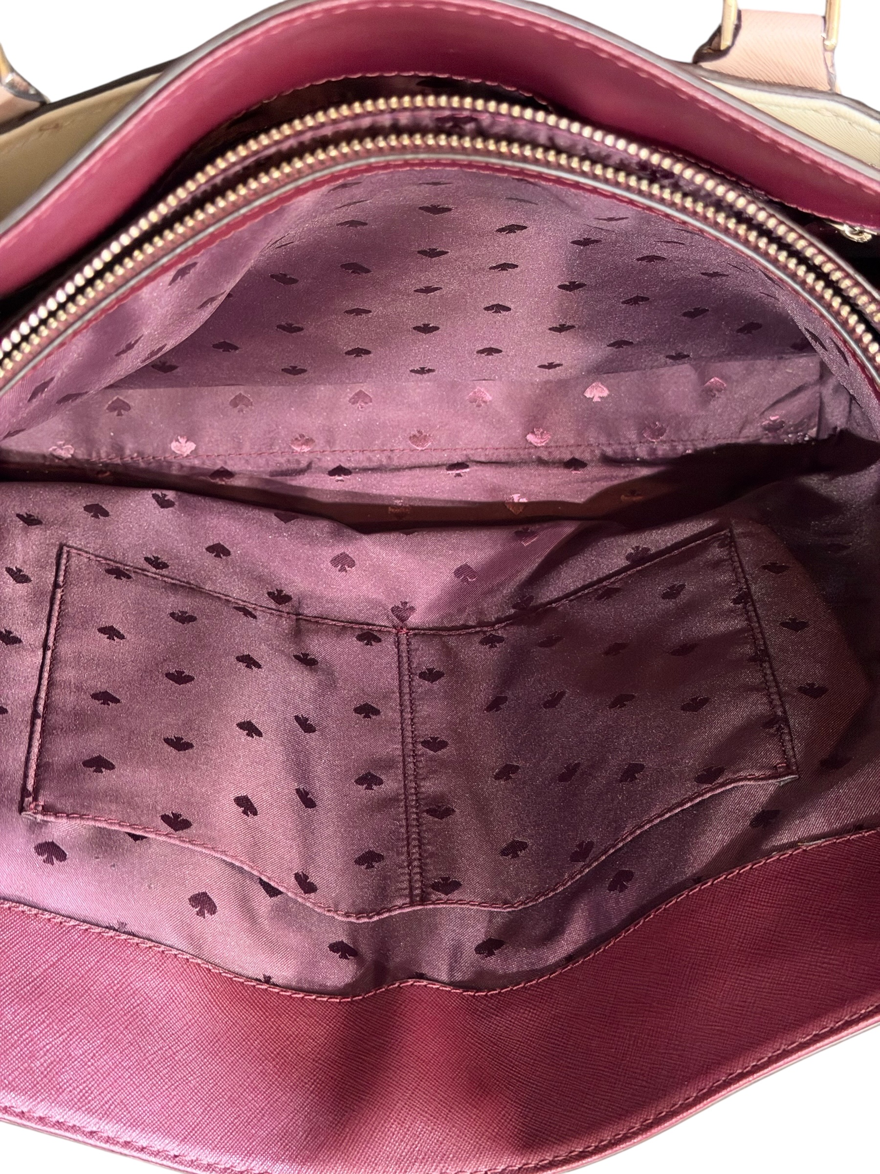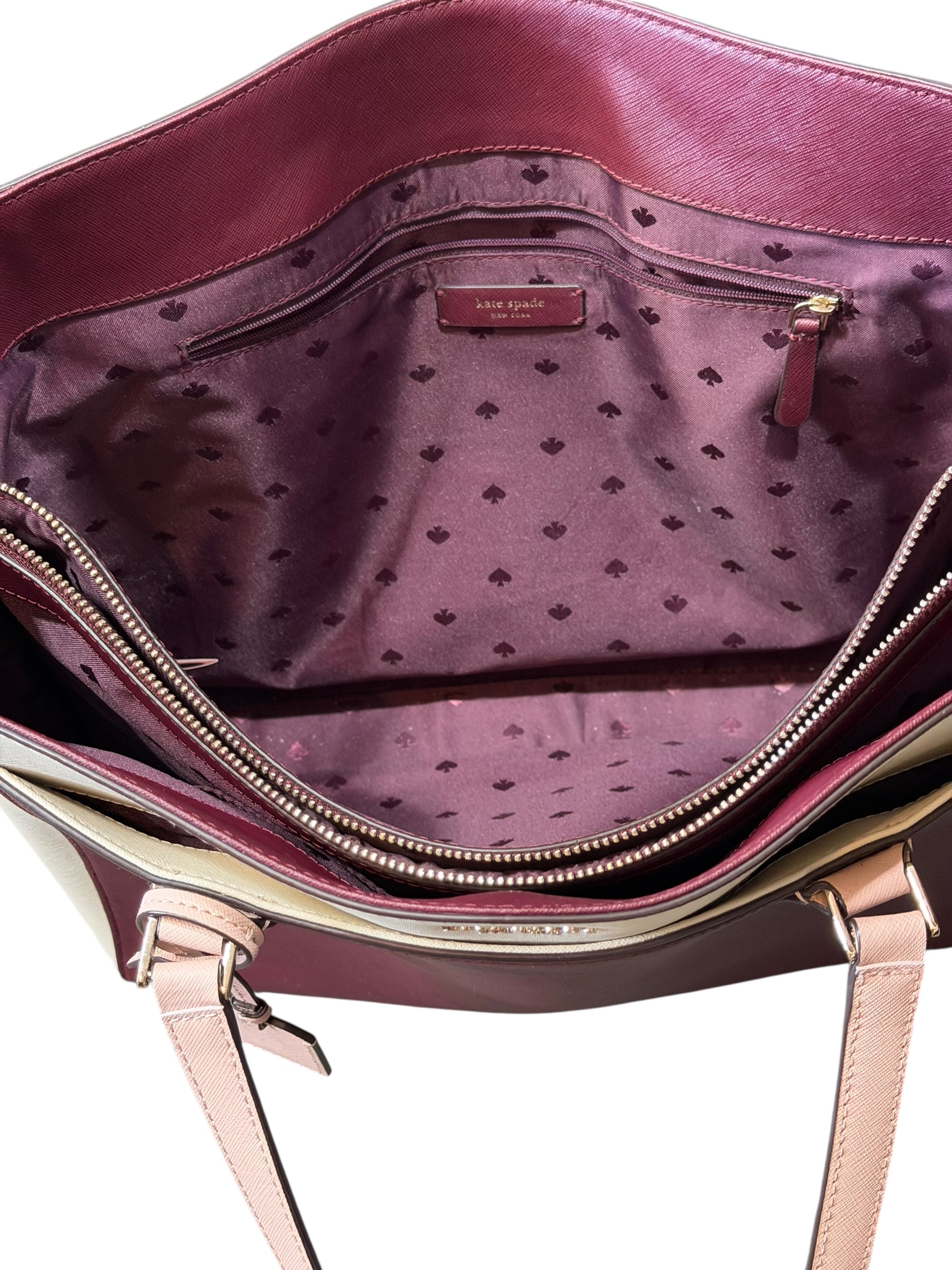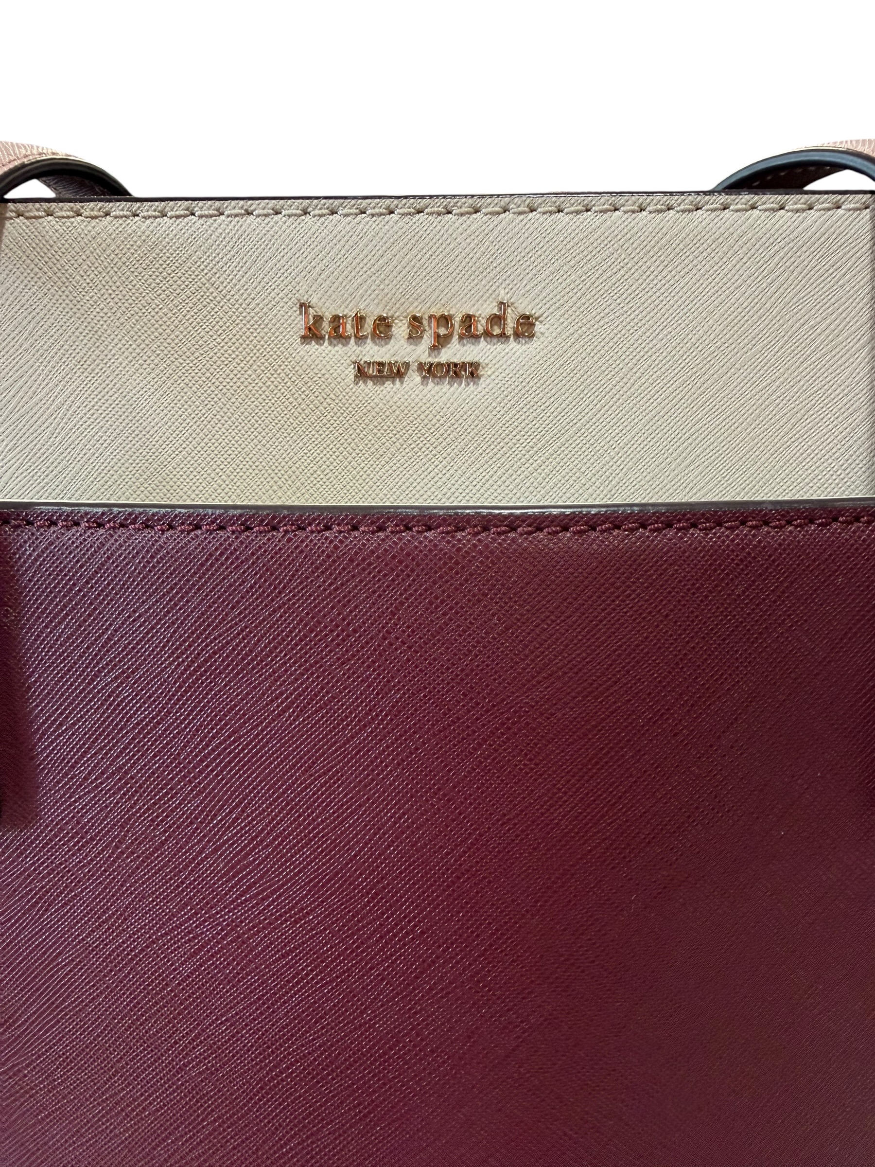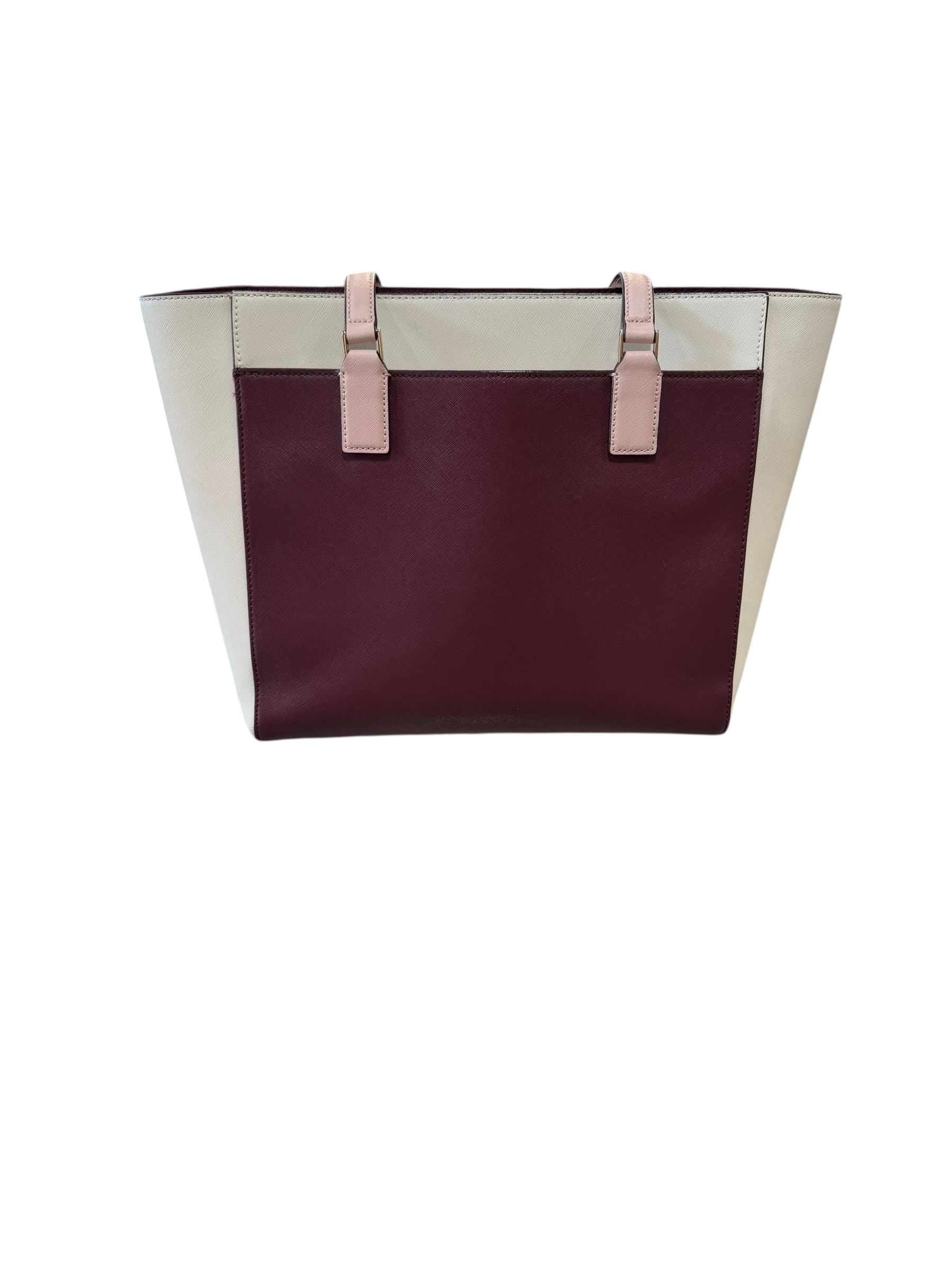 Elegant and practical Kate Spade New York color-block tote bag crafted in saffiano leather. The bag features a sophisticated combination of burgundy center panel with cream side panels and soft blush pink shoulder straps. Structured silhouette makes it ideal for work, everyday use, or travel.