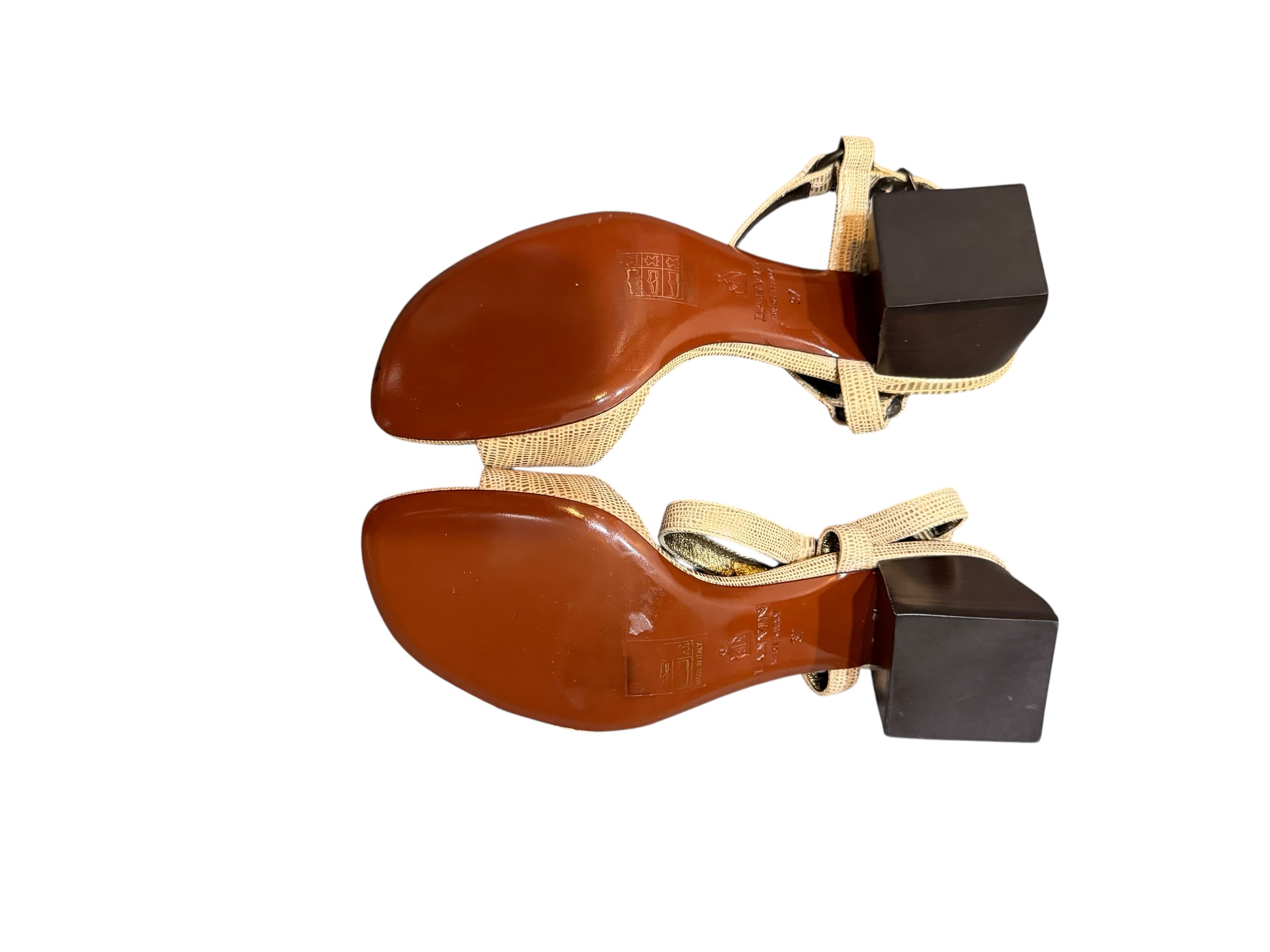 Lanvin Paris metallic-gold embossed leather sandals with an ankle strap and a block heel—elegant designer footwear made in Italy.