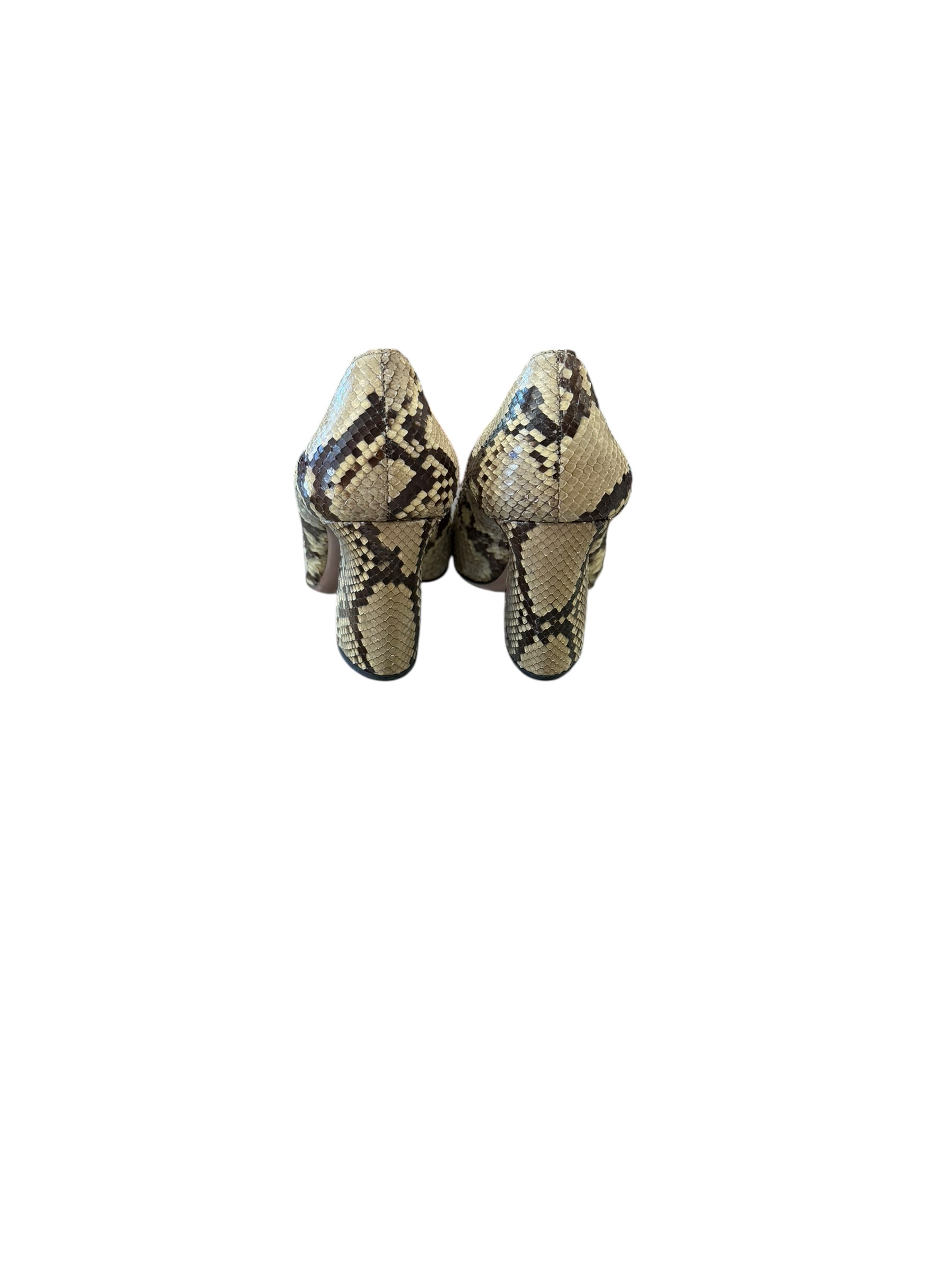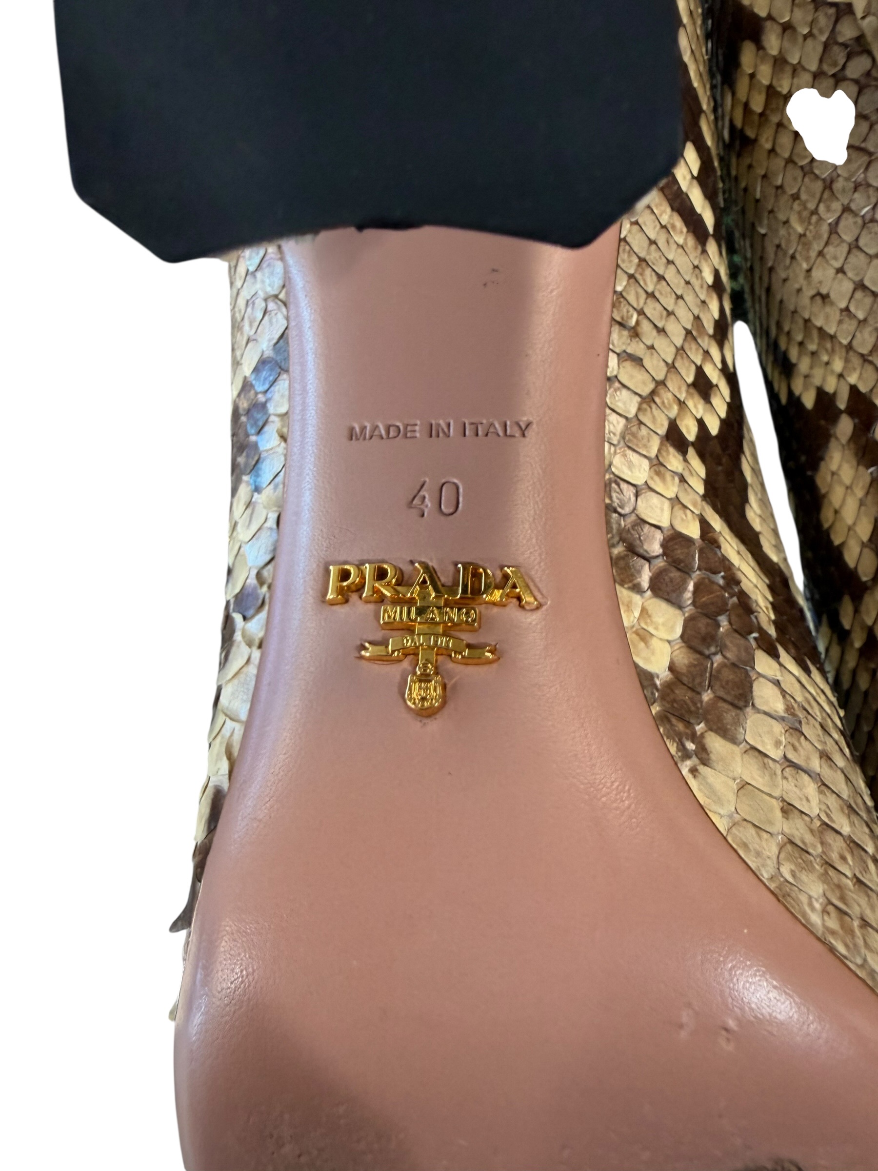Elegant authentic Prada Milano snakeskin pumps crafted in Italy from genuine python leather. Classic feminine silhouette with rounded toe and signature Prada metal logo accent. A timeless luxury shoe perfect for evening wear, special occasions, or sophisticated everyday styling.
