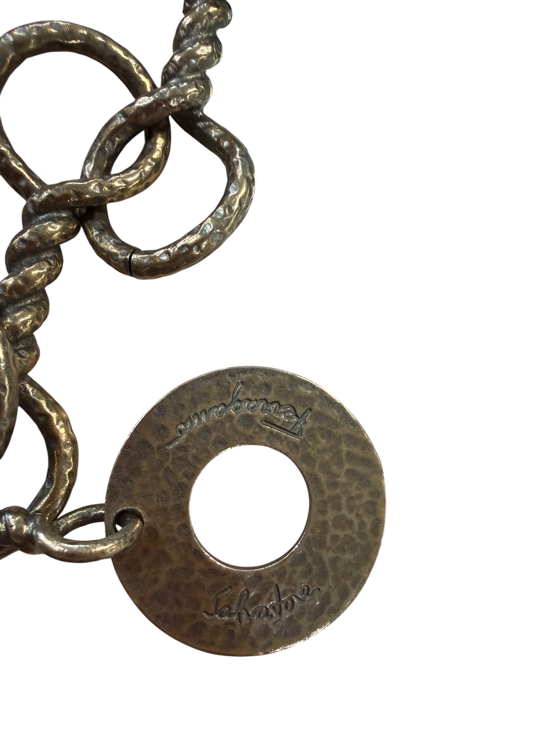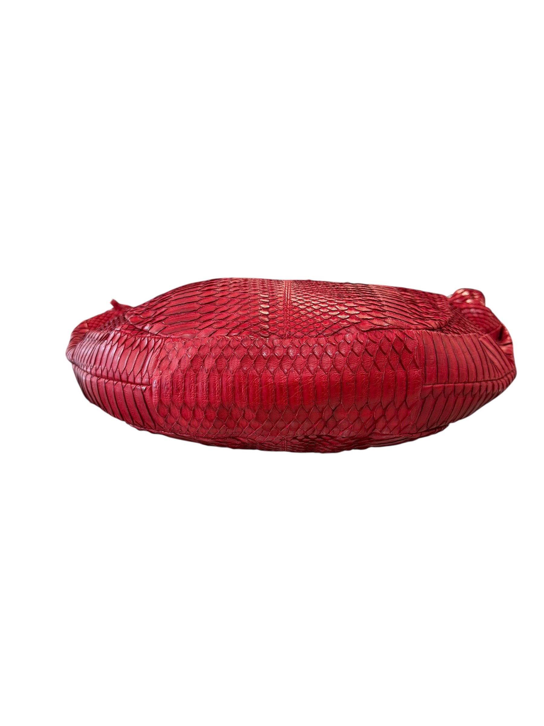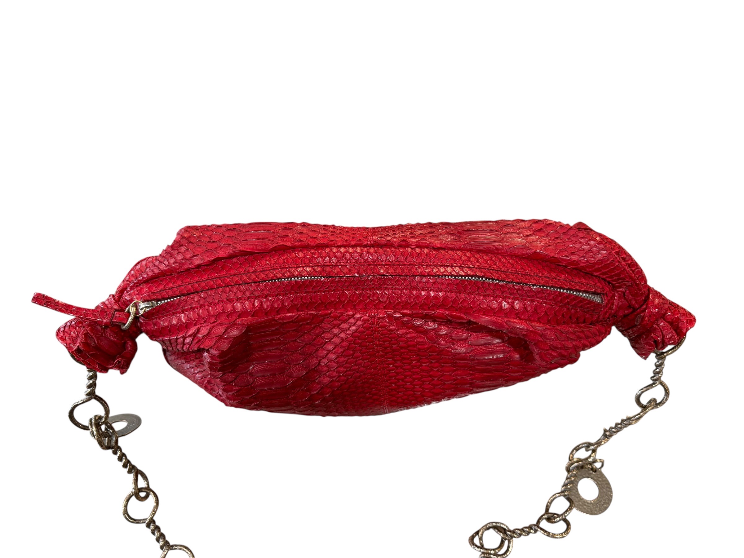 Elegant Salvatore Ferragamo red leather shoulder bag crafted in Italy. This sophisticated designer handbag features rich textured leather, a structured silhouette, and a unique metal chain shoulder strap. The vibrant red color makes it a statement accessory suitable for both evening wear and elevated everyday styling.
